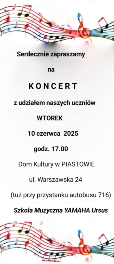 Serdecznie zapraszamy na koncert z udziałem naszych uczniów we wtorek, 10 czerwca o godzinie 17.00.